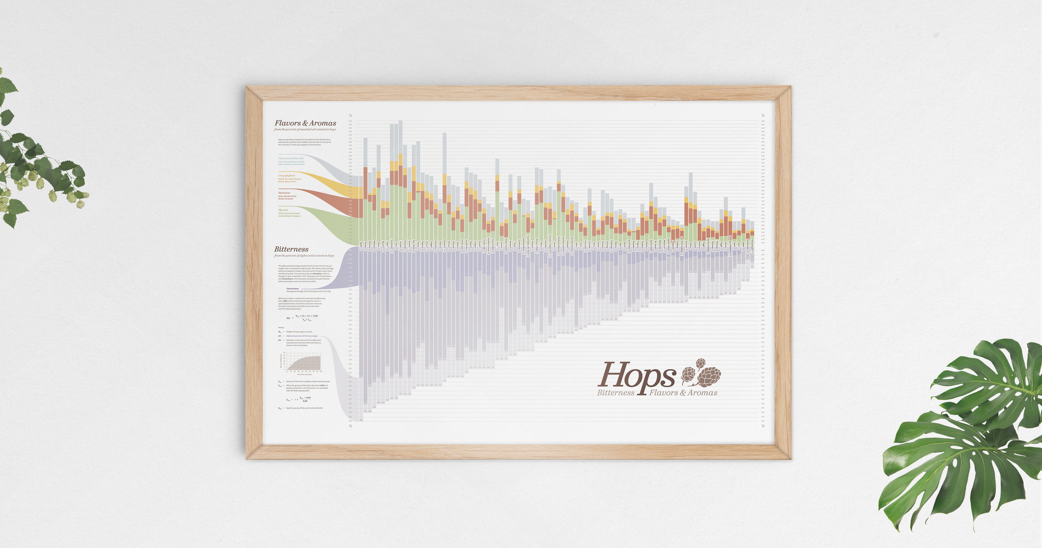 Visualizing the bitterness, flavors, and aromas of 90 varieties of beer brewing hops. 24" by 36" print on Sundance 80 lb cover stock natural textured paper.